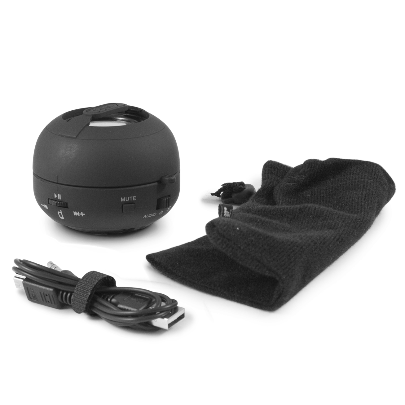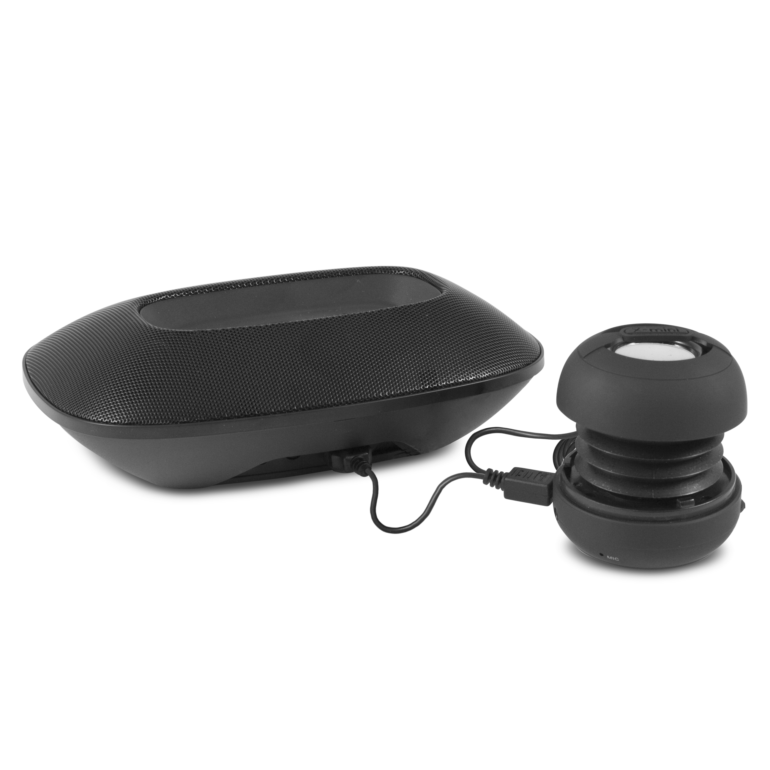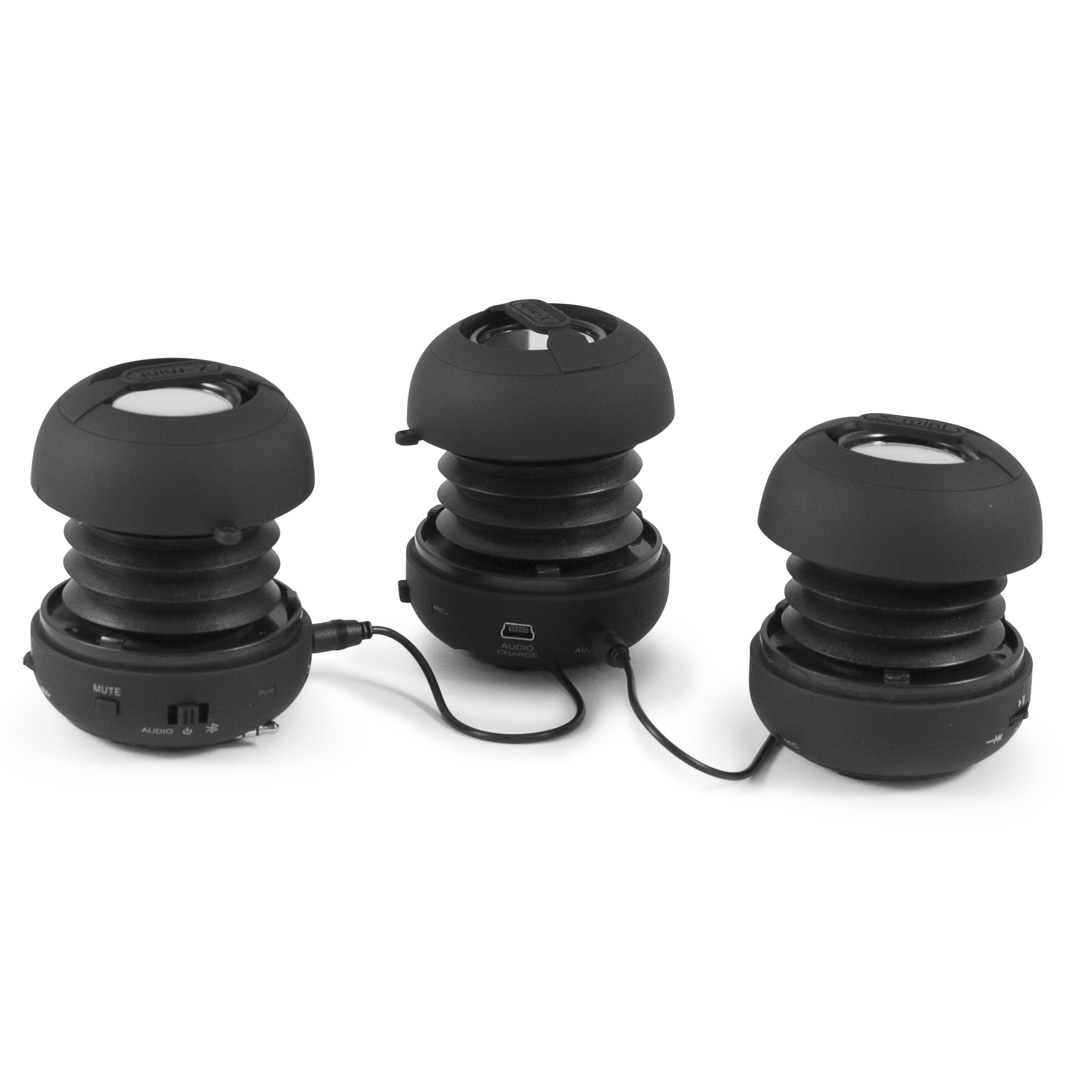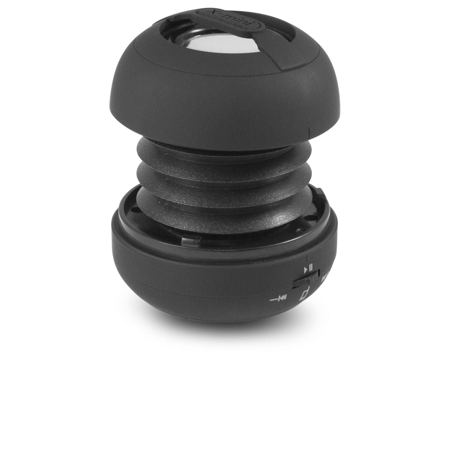 Product Specs- Model # XAM11-B- Bluetooth with Bluetooth dongle capabilities - PLAY, PAUSE, NEXT TRACK, and PREVIOUS TRACK control of Bluetooth paired devices- Onboard Volume Control - Built-in mic for audio conferencing - Mute button on the speaker to mute sound in any mode (including dongle mode)- 40mm Aluminum driver - 2.5 watt amp - “Buddy Jack” TM - Buddy jack as many as you like for more fun.- Bluetooth playback time up to 4 hours, talk time up to 8 hours- Play your favorite tunes from any Bluetooth-equipped device while you control tracks and volume wirelessly.- Stowaway: 3.5mm cable to get connected to your music source.- Long lasting - Up to 8 hours of continues playtime using its embeded rechargable battery.- Rechargeable- Dimensions: 50.0mm X 62.0mm (closed resonator)- Weight: 95.2gCondition - NewWarranty - 1 Year Manufacturer’sShips Via - FedEx SmartPostWhats in the box!?- X-Mini Bluetooth Speaker- Manual- Combo USB/Mini-USB/3.5mm Audio cable for charging, audio out. and dongle use- Protective pouchProduct Pics- [The speaker, expanded][1]- [In the box (& the speaker, unexpanded)][2]- [Plugged into the AUX in of a speaker dock][3]- [Three speakers, linked together][4] [1]: