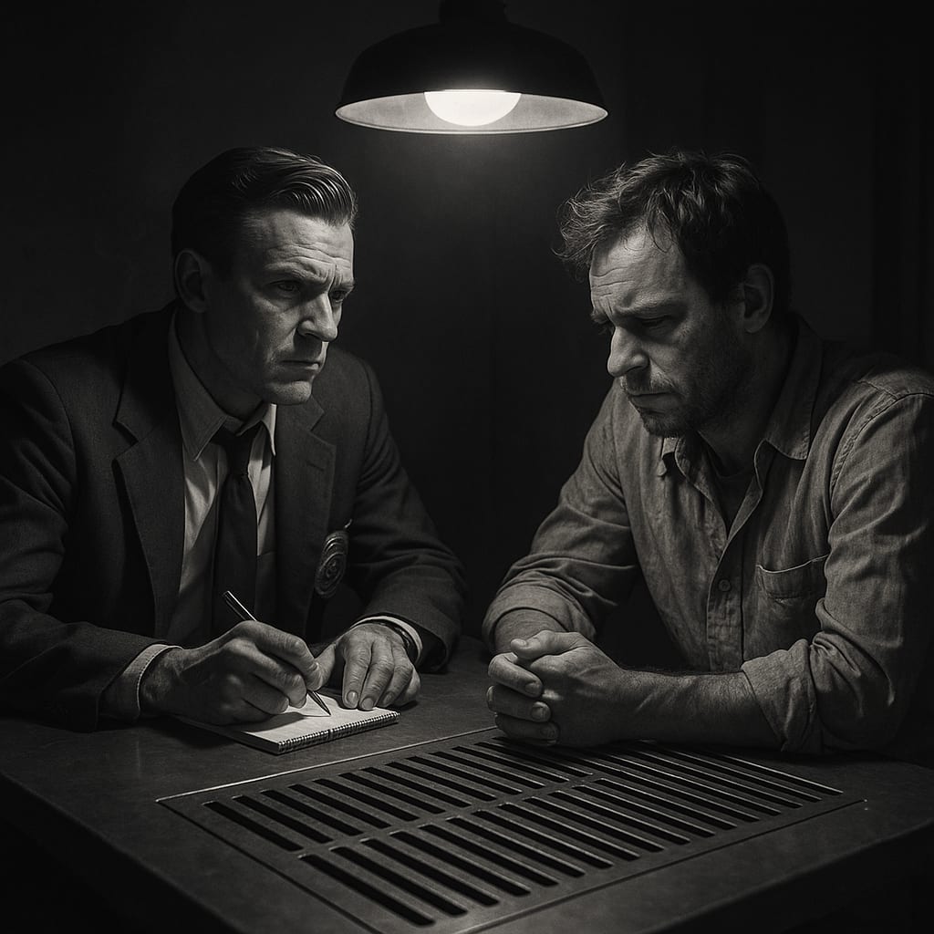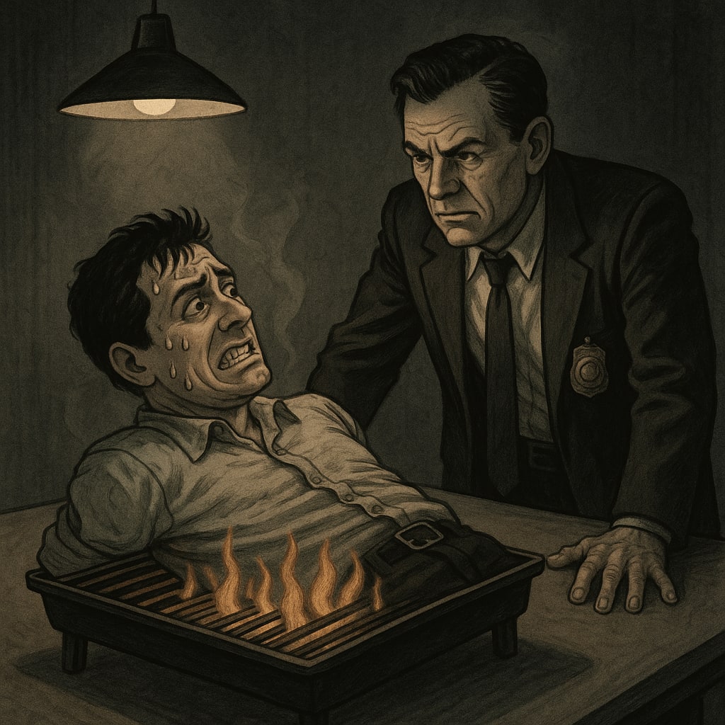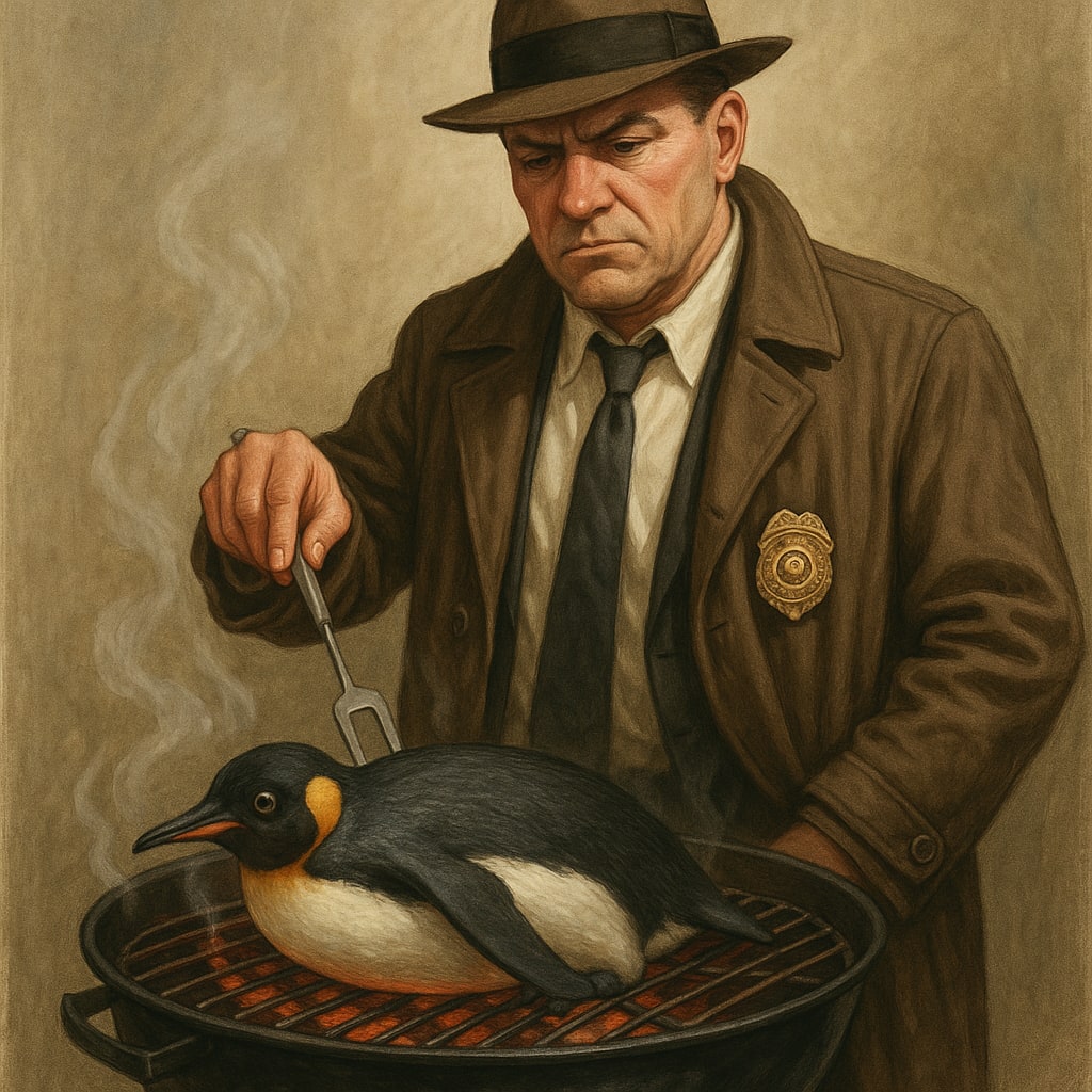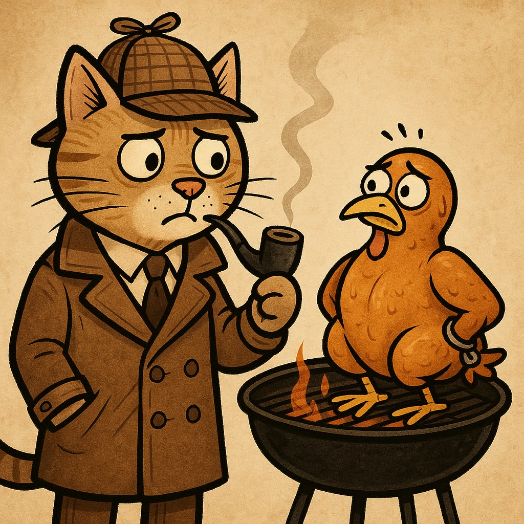 /showme a detective cat with a guilty suspect about to be cooked on a BBQ grill