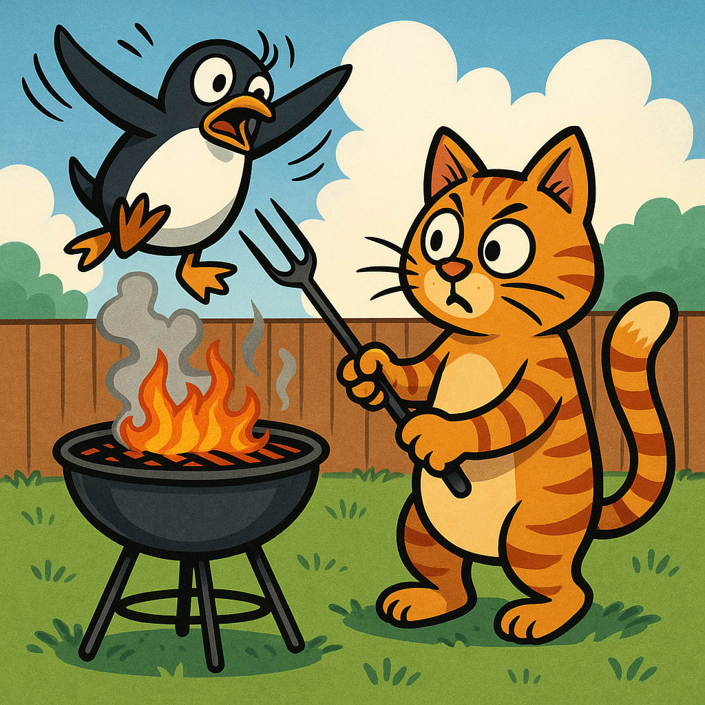 /showme a cat about to BBQ a penguin but it’s trying to fly away