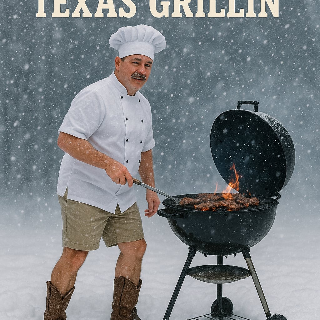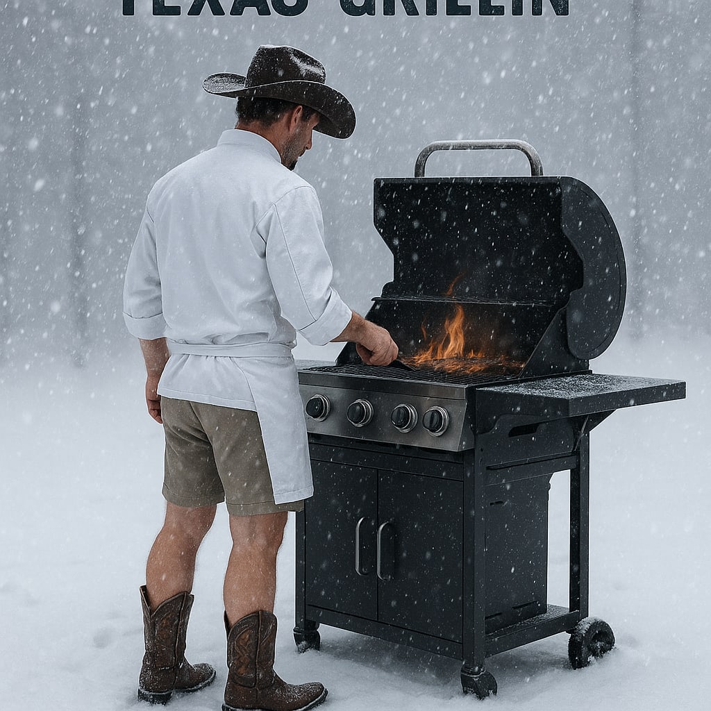 /showme a chef in shorts, cowboy hat, and cowboy boots grilling in a snowstorm on a 3-burner grill and label it “Texas Grillin’” and label it “Texas Grillin’” and mark it “Copyright phendrick, February 2026”