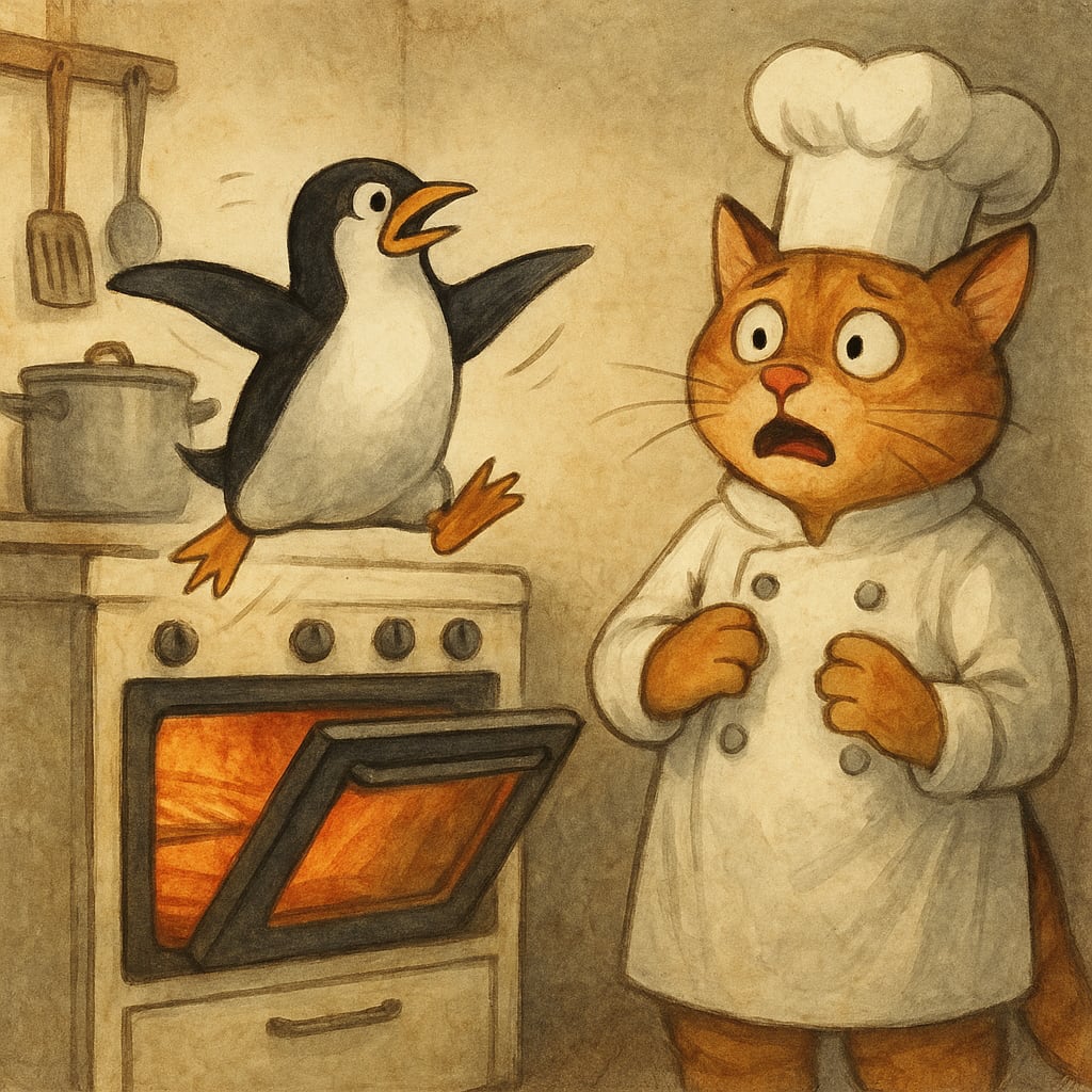 PossiblyPawsibly from anything with heat./showme a penguin trying to fly away from an oven while a cat chef looks on in disbelief