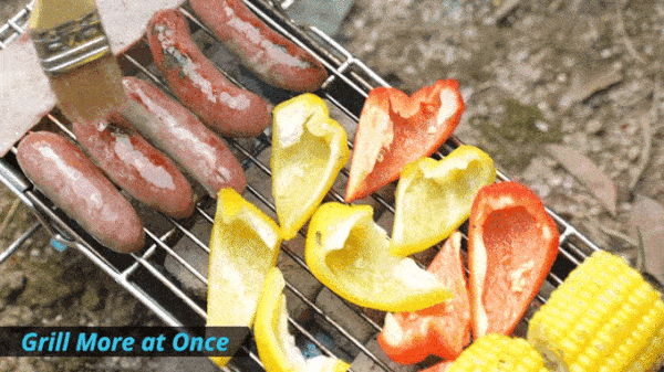 I have a fold-up grill sort of like this one, but the main part is V-shaped instead of box-shaped. The problem with mine and the one here is that the grill height is not adjustable and the grill is just too damn close to the hot coals to not burn things. Yes, I could make a smaller bed of coals, but then I’d have to reserve one end for adding coals and burning them down before pushing them to the cooking side.