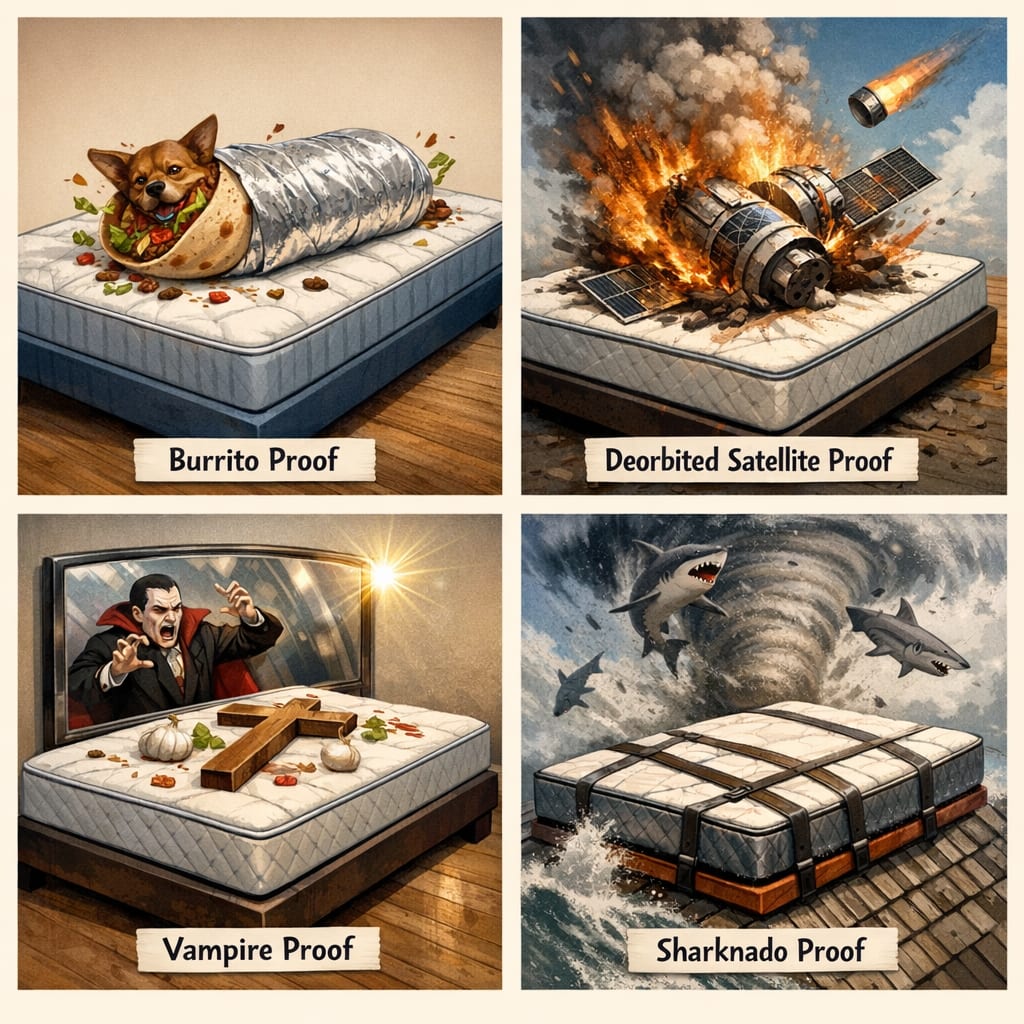 /showme foyr panel illustration of mattresses that are: burrito proof, deorbited satellite proof, vampire proof, and sharknado proof