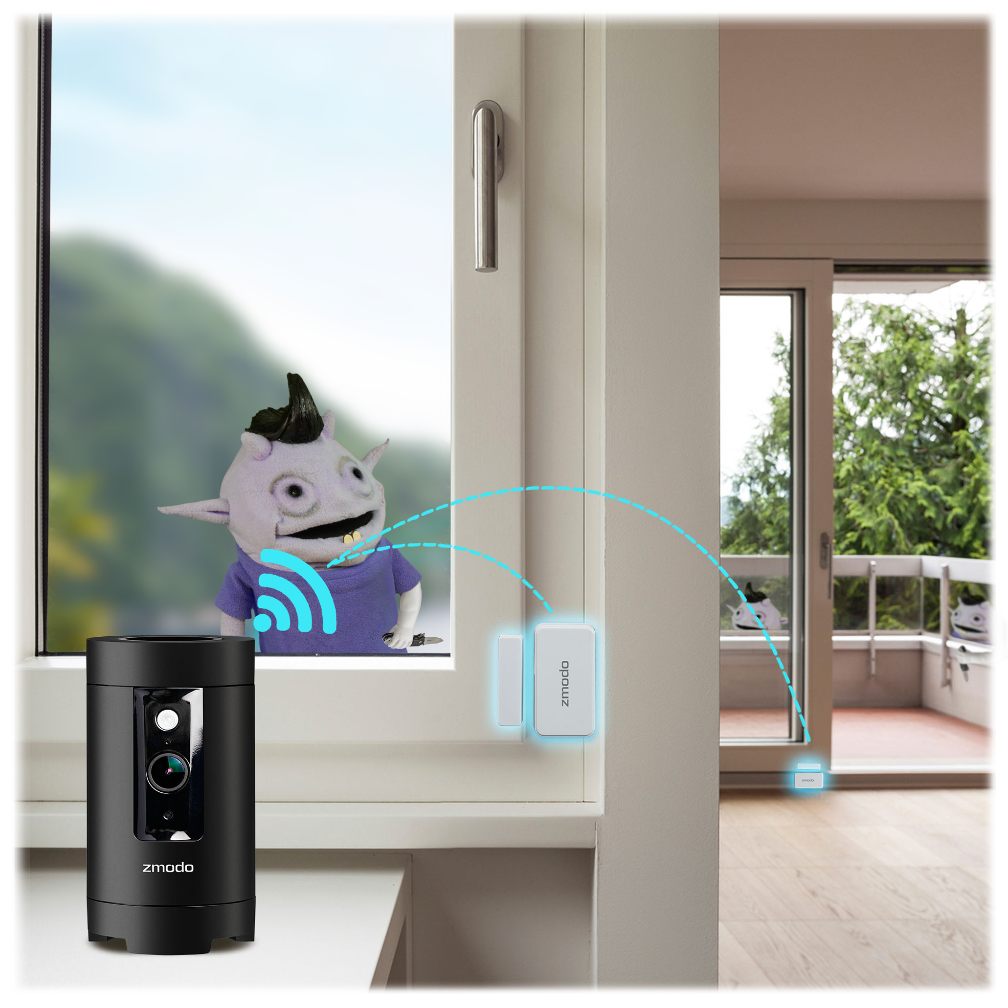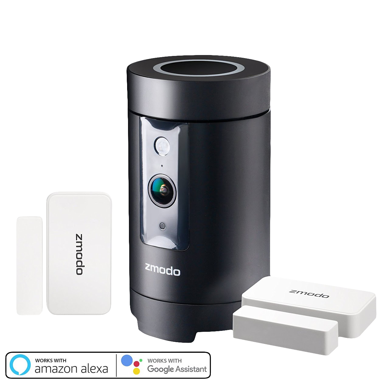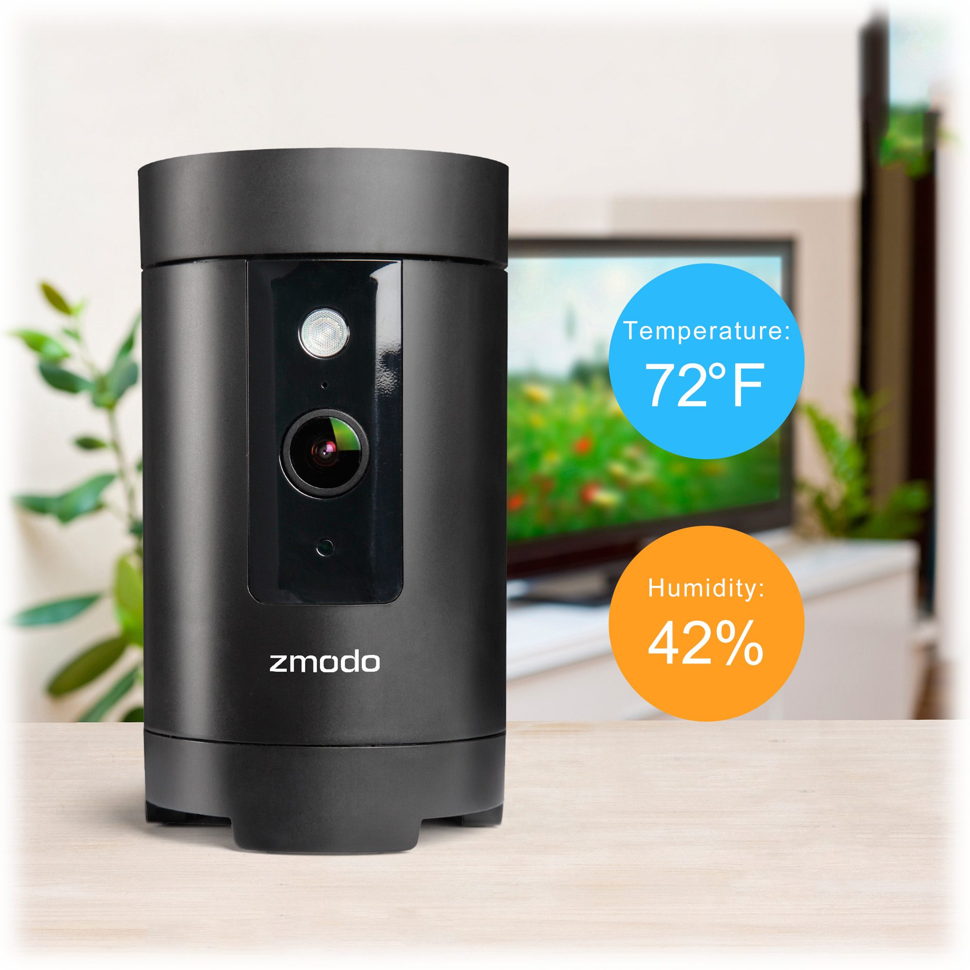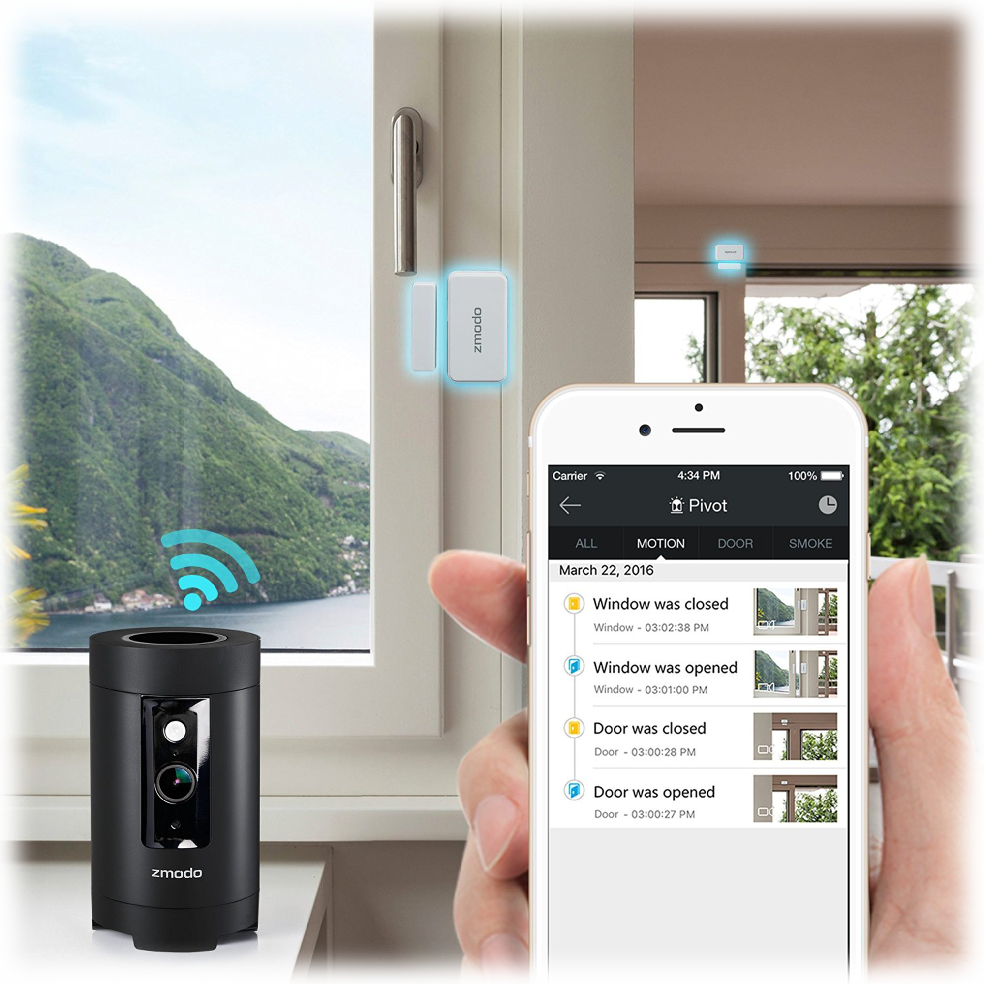 Specs====- Model: ZM-SHP001B- Condition: New- Camera - 1080p HD Color Sensor - 135 Angle of View - 4x Digital Zoom - 2.1mm Lens- Compatible with Zmodo smart products- 360 motion detection and 360 pan range- Sensors: Temperature, humidity, door/window sensors (2 included, supports up to 32)- Encryption: 256-bit- Two-way audio with internal mic and bluetooth speaker- Storage: 16GB built-in- Connectivity requirements: WiFi, iPhone/iPad/Android- Nightvision: up to 32 ft, automatic IR cut- Power: DC 5V micro USB- Dimensions: 75mm x 135mm- Door/Window sensors - Battery: 240mAh 3V Lithium Cell - For indoor or covered use (32F - 104F) - Main Portion Dimensions: 2.44" 1.34" 0.55" - Magnetic Portion Dimensions: 2.11" 0.56" 0.55"- User manual What’s in the Box?====1x Pivot camera2x Door/window sensors1x 5ft micro USB power adapterPictures====EverythingCameraRotatingBoxTemperature and stuffBabys love it!Phone powerBluetooth powerLots of screens hereGET TO THE SAFE ROOMPrice Comparison====$88 at Amazon