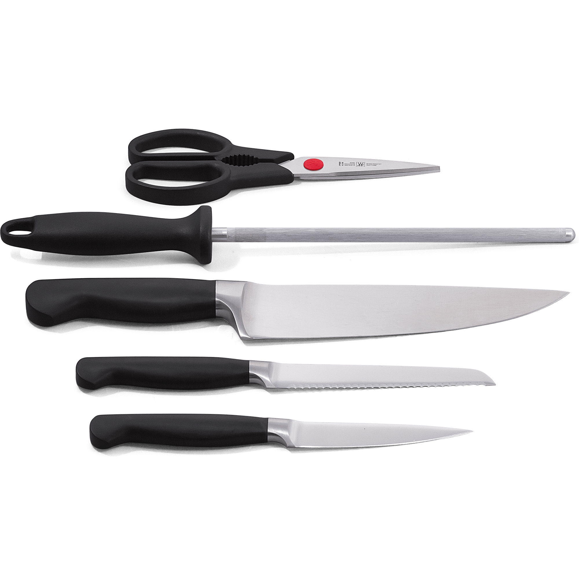 Specs====- Zwilling J.A. Henckels Pure 6-Piece Knife Block Set- High Carbon Stainless Steel- Ice-Hardened Blade- Firm Comfortable Grip- No rivet handle- 4" Paring Utility Knife- 5" Serrated Utility knife- 8" Chef’s Knife- Kitchen Shears- Sharpening Steel- Hardwood Block- Made in GermanyConditon - New Warranty - Limited Lifetime - ZwillingShips Via - FedEx SmartPost - $5 Shipping, Free with VMP What’s in the Box?!====- 4" Paring Utility Knife- 5" Serrated Utility knife- 8" Chef’s Knife- Kitchen Shears- Sharpening Steel- Hardwood BlockPictures====BlockKnivesPrice Check====$203.13 at AmazonFind a relevant price comparison? Please share it in a reply to this comment